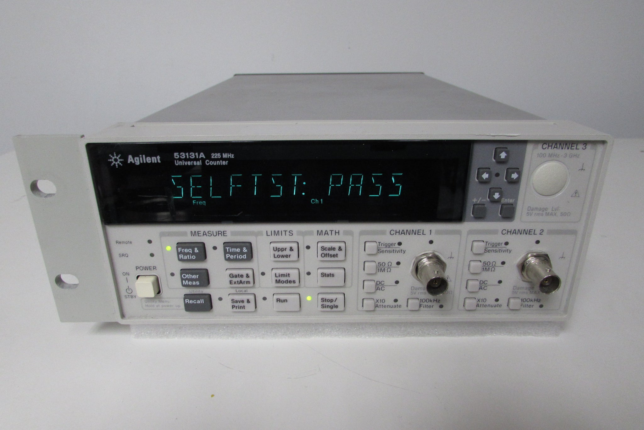 The Agilent 53131A has a frequency resolution of 10 digits per second, 500 ps time interval resolution and a complete set of test and analysis features. The unit comes with two 225 MHz channels, and you can choose an optional third channel that measure up to 3 GHz, 5 GHz, or 12.4 GHz. The Agilent 53131A has the capability to do the job quickly and correctly from fast signal processing to automated limit tests.