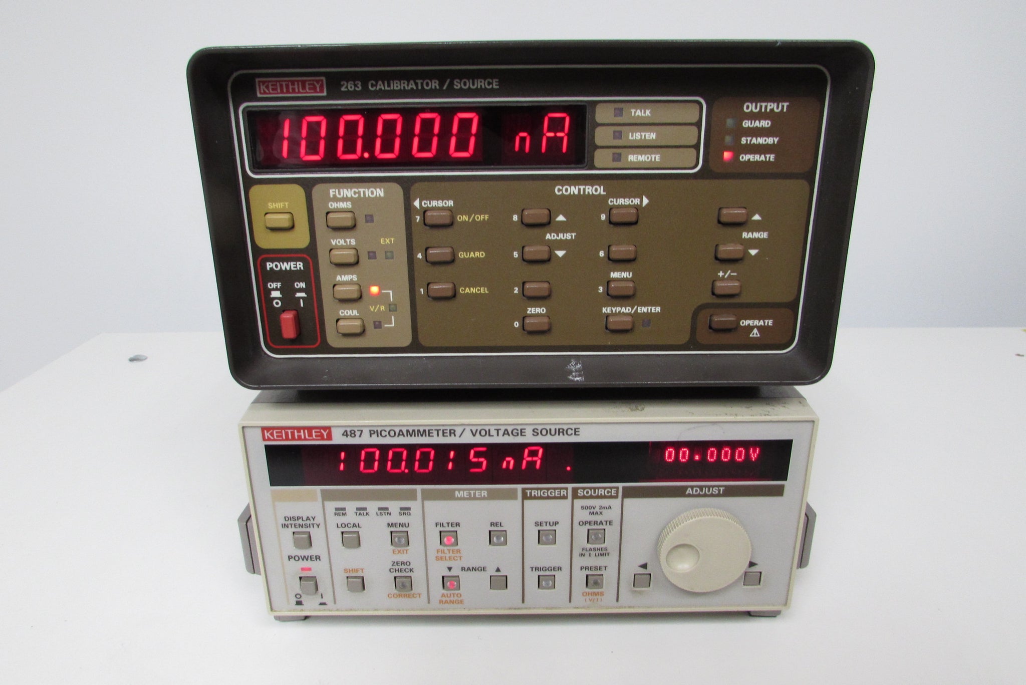 The Keithley 487 is designed for measurement of low currents and very high resistances. This instrument incorporates all the capabilities of the 486, and adds a programmable ±500V source. This combination of picoammeter and voltage source provides a powerful high resistance meter and fast picoammeter in one instrument.