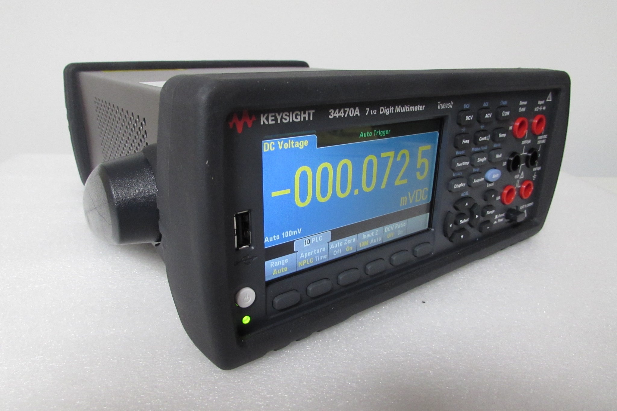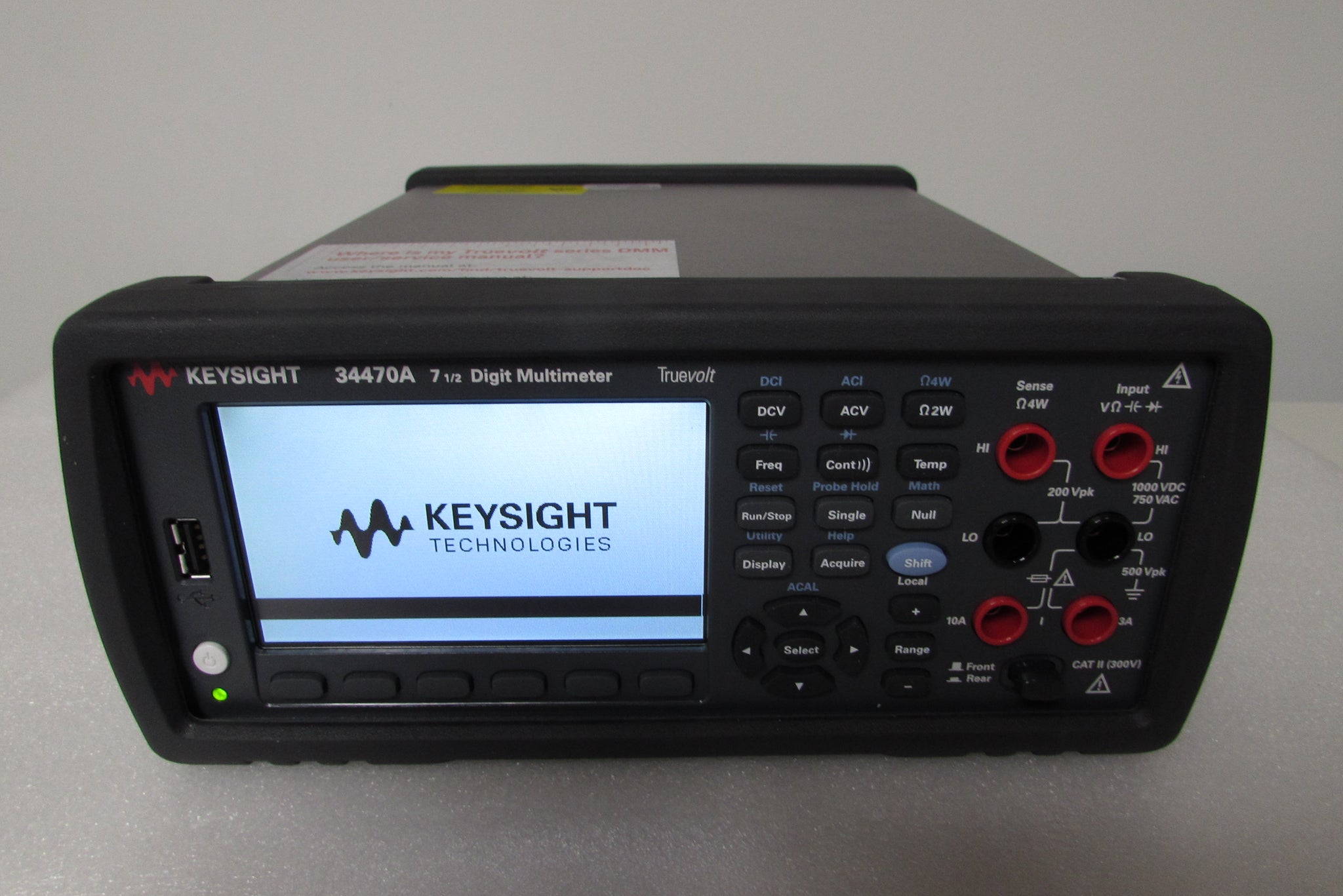 The Keysight Agilent 34470A is a 7.5 digit bench multimeter from Keysight Agilent. A multimeter is an instrument used to test and measure alternating current (AC) or direct current (DC) voltage, resistance, and electric current. Multimeters combine voltmeters, ammeters, and ohmmeters. Electricians use multimeters to run diagnostics on batteries, switches, components, power sources, and motors.